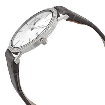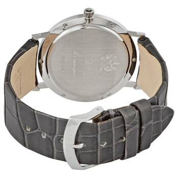 18kt white gold case with a Grey (alligator) leather strap. Fixed 18kt white gold bezel set with 72 diamonds. Silver dial with white gold hands and index hour markers. Dial Type: Analog. Small seconds sub-dial. Piaget calibre 450P hand wind movement, containing 18 Jewels, composed of 131 parts, bitting at 21600 vph, and has a power reserve of approximately 43 hours. Scratch resistant sapphire crystal. Pull / push crown. Solid case back. Round case shape. Case size: 34 mm. Case thickness: 6.3 mm. Water resistant at 30 meters / 100 feet. Functions: hour, minute, second. Additional Info: case in 18kt white gold set with 72 brilliant-cut diamonds (approx. 0.5 ct). Altiplano Series. Luxury watch style. Watch label: Swiss Made. Item Variations: GOA39106, G0A39106, 39106. Piaget Altiplano Silver Dial Grey Alligator Leather Ladies Watch GOA39106.
