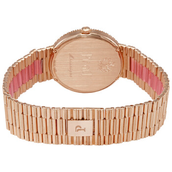 18kt rose gold case and bracelet. Fixed 18kt rose gold bezel set with diamonds. Silver dial with rose gold-tone hands and diamond hour markers. Dial Type: Analog. Piaget Calibre 430P Hand Wind movement, containing 18 Jewels, composed of 131 parts, bitting at 21600 vph, and has a power reserve of approximately 43 hours. Scratch resistant sapphire crystal. Solid case back. Round case shape, case size: 34 mm, case thickness: 5.2 mm. Integrated clasp. Water resistant at 30 meters / 100 feet. Functions: hour, minute. Altiplano Traditional Series. Luxury watch style. Watch label: Swiss Made. Item Variations: GOA37046, G0A37046, 37046. Piaget Altiplano Traditional Hand Wind Diamond Silver Dial Ladies Watch G0A37046.