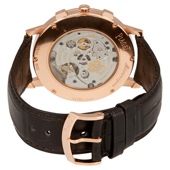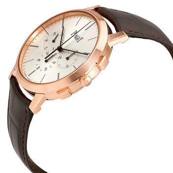 18kt rose gold case with a brown (alligator) leather strap. Fixed 18kt rose gold bezel. Silver dial with black hands and index hour markers. Minute markers around the outer rim. Dial Type: Analog. Chronograph - three sub-dials displaying: 60 second, 30 minute and 24 hour. Piaget calibre 883P hand wind movement, containing 30 Jewels, composed of 240 parts, bitting at 21600 vph, and has a power reserve of approximately 50 hours. Scratch resistant sapphire crystal. Pull / push crown. Transparent case back. Round case shape. Case size: 41 mm. Case thickness: 8.24 mm. Tang clasp. Water resistant at 30 meters / 100 feet. Functions: chronograph, column wheel, flyback, GMT, second time zone, hour, minute, small second. Altiplano Series. Luxury watch style. Watch label: Swiss Made. Item Variations: GOA40030, G0A40030, 40030. Piaget Altiplano Ultra-thin 18K Rose Gold Chronograph Flyback Men's Watch GOA40030.