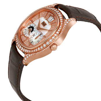 18kt rose gold set with diamonds case with a brown alligator leather strap. Fixed bezel set with diamonds bezel. Mother of pearl dial with gold-toned hands and index hour markers. Date display at the 12 o'clock position. Two - 60 second and 12 hour. Automatic movement. Scratch resistant sapphire crystal. Case diameter: 42 mm. Case thickness: 8.9 mm. Cushion case shape. Folding clasp. Water resistant at 30 meters / 100 feet. Functions: chronograph, date, hour, minute, second. Luxury watch style. Watch label: Swiss Made. Piaget Emperador Mother of Pearl 18kt Rose Gold Diamond Men's Watch GOA32020.