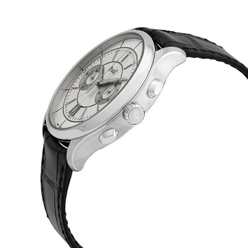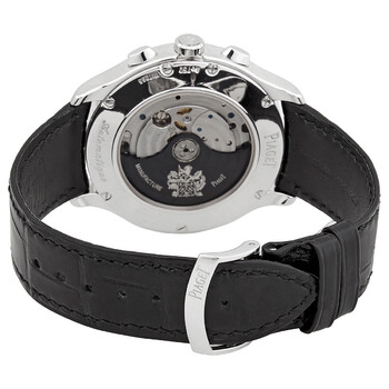 18kt white gold case with a black (alligator) leather strap. Fixed 18kt white gold bezel. Silver dial with white gold hands and index hour markers. Minute markers. Arabic numeral minute markers (at 5 minute intervals). Dial Type: Analog. Date display at the 6 o'clock position. Chronograph - two sub-dials displaying: 24 hour and 30 minute. Piaget calibre 882P automatic movement, containing 35 Jewels, composed of 275 parts, bitting at 28800 vph, and has a power reserve of approximately 50 hours. Scratch resistant sapphire crystal. Pull / push crown. Transparent case back. Round case shape. Case size: 43 mm. Case thickness: 10.4 mm. Deployment clasp. Water resistant at 30 meters / 100 feet. Functions: chronograph, column wheel, flyback, date, GMT, second time zone, hour, minute, second. Gouverneur Series. Luxury watch style. Watch label: Swiss Made. Piaget Gouverneur 18kt White Gold Chronograph Automatic Silver Dial Men's Watch G0A38112.