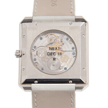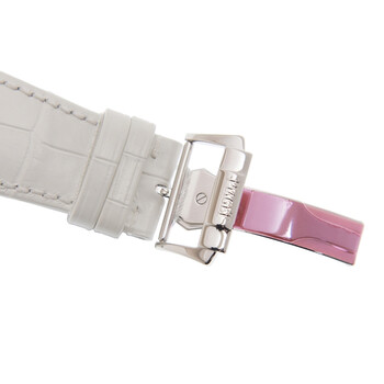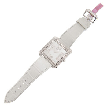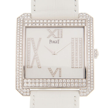 Silver-tone 18kt white gold case with a white alligator band. Fixed silver-tone diamond set bezel. White mother of pearl dial with silver-tone hands and Roman numeral hour markers. Dial Type: Analog. Hand wind movement. Screw down crown. Transparent case back. Square case shape. Case size: 47 mm. Deployment clasp. Functions: hour, minute. Dress watch style. Watch label: Swiss Made. Piaget Limelight Protocole XXL Diamond Unisex Watch GOA34017.