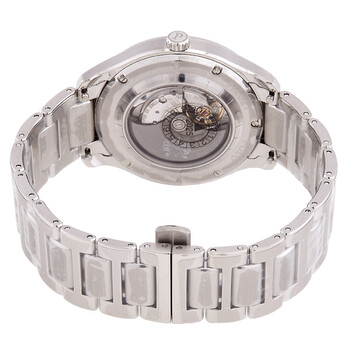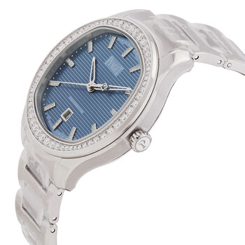 Silver-tone stainless steel case and bracelet. Fixed silver-tone stainless steel bezel with 60 brilliant-cut diamonds. Blue guilloche dial with silver-tone hands and diamond hour markers. Minute markers around the outer rim. Dial Type: Analog. Date display at the 6 o'clock position. Piaget Calibre 500P1 automatic movement with a 40-hour power reserve. Scratch resistant sapphire crystal. Transparent see through case back. Cushion case shape, case size: 36 mm, case thickness: 8.8 mm. Fold over clasp with a safety release. Water resistant at 50 meters / 165 feet. Functions: date, hour, minute, second. Polo Date Series. Luxury watch style. Watch label: Swiss Made. Piaget Polo Date Automatic Diamond Blue Dial Watch G0A47027.