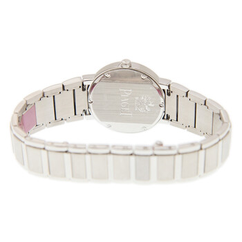 18kt white gold case with a 18kt white gold bracelet. Fixed 18kt white gold bezel set with diamonds. Silver dial with white gold hands and diamond-set index hour markers. Minute markers around the outer rim. Dial Type: Analog. Piaget calibre 690P quartz movement. Scratch resistant sapphire crystal. Solid case back. Round case shape. Case size: 28 mm. Fold over clasp. Water resistant at 30 meters / 100 feet. Functions: hour, minute. Polo Series. Dress watch style. Watch label: Swiss Made. Item Variations: GOA26031 , A26031 , 26031. Piaget Polo Small Ladies Watch G0A26031.