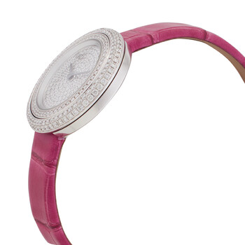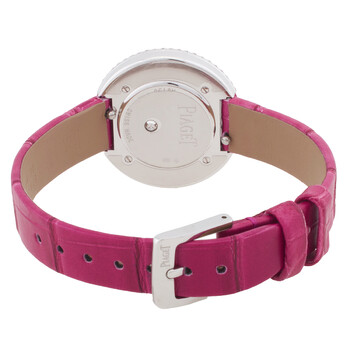 18kt white gold case with a pink alligator leather strap. Fixed 18kt white gold bezel. Diamond-set dial with silver-tone hands. No markers. Dial Type: Analog. Piaget Calibre 56P quartz movement. Scratch resistant sapphire crystal. Solid case back. Round case shape, case size: 29 mm. Water resistant at 30 meters / 100 feet. Functions: hour, minute. Possession Series. Luxury watch style. Watch label: Swiss Made. Piaget Possession Diamond 18kt White Gold Quartz Ladies Watch G0A44098.