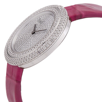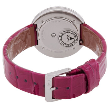 18kt white gold case set with 181 brilliant-cut diamonds (approx. 2.11 ct). Red alligator leather strap. Rotating bezel. Diamond paved dial set with 239 brilliant-cut diamonds (approx. 1.21 ct). Dial Type: Analog. Piaget Calibre 56P quartz movement. Scratch resistant sapphire crystal. Transparent see through case back. Round case shape, case size: 34 mm, case thickness: 7.47 mm. Buckle clasp. Water resistant at 30 meters / 100 feet. Functions: hour, minute. Possession Series. Luxury watch style. Watch label: Swiss Made. Piaget Possession Quartz Diamond Ladies Watch G0A44299.