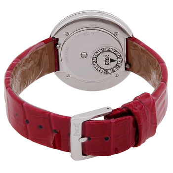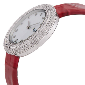 18kt white gold case set with diamonds. Red leather strap. 18kt white gold bezel set with diamonds. Mother of pearl dial with silver-tone hands and diamond hour markers. Dial Type: Analog. Piaget Calibre 358P quartz movement. Scratch resistant sapphire crystal. Round case shape, case size: 34 mm. Buckle clasp. Water resistant at 30 meters / 100 feet. Functions: hour, minute. Possession Series. Luxury watch style. Watch label: Swiss Made. Piaget Possession Quartz Diamond Mother of Pearl Dial Ladies Watch G0A46095.