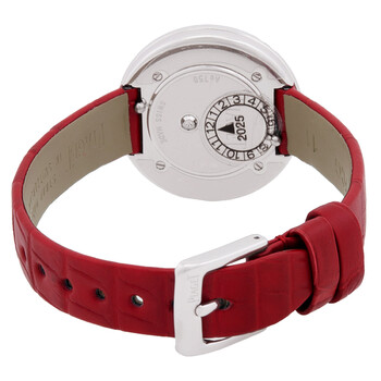 18kt white gold case with a red alligator leather strap. Rotating 18kt white gold set with 42 brilliant-cut diamonds (approx. 1.04 ct). Silver dial with silver-tone hands and diamond hour markers. Dial Type: Analog. Piaget Calibre 56P quartz movement. Scratch resistant sapphire crystal. Pull / push crown. Solid case back. Round case shape, case size: 29 mm, case thickness: 7.47 mm. Push button deployant buckle clasp. Water resistant at 30 meters / 100 feet. Functions: hour, minute. Possession Series. Luxury watch style. Watch label: Swiss Made. Piaget Possession Quartz Diamond Silver Dial Ladies Watch G0A44284.