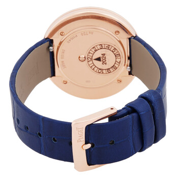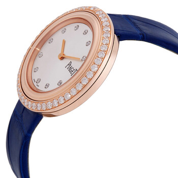 18kt rose gold case with a blue alligator/crocodile leather strap. Fixed 18kt rose gold bezel with diamond set. Silver dial with rose gold-tone hands and diamond hour markers. Dial Type: Analog. Piaget Calibre 56P quartz movement. Scratch resistant sapphire crystal. Pull / push crown. Solid case back. Round case shape, case size: 34 mm, case thickness: 7.47 mm. Tang buckle clasp. Water resistant at 30 meters / 100 feet. Functions: hour, minute. Possession Series. Luxury watch style. Watch label: Swiss Made. Piaget Possession Quartz Diamond Silver Dial Ladies Watch G0A44292.