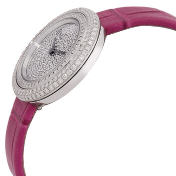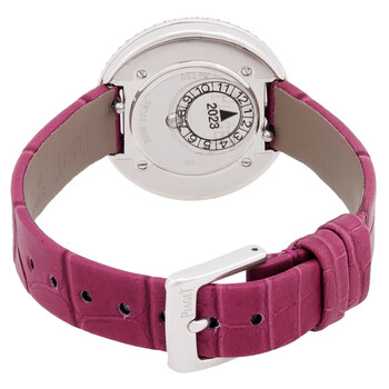 18kt white gold case with a pink alligator band. Uni-directional rotating bezel with diamond set 18kt white gold. Silver-tone dial with silver-tone hands. Dial Type: Analog. Piaget Calibre 56P quartz movement. Scratch resistant sapphire crystal. Solid case back. Round case shape, case size: 34 mm. Buckle clasp. Water resistant at 30 meters / 100 feet. Functions: hour, minute. Possession Series. Luxury watch style. Watch label: Swiss Made. Piaget Possession Quartz Diamond Silver Dial Ladies Watch G0A44298.
