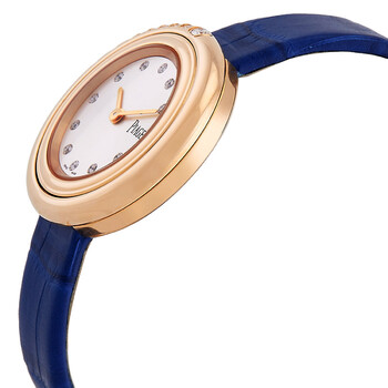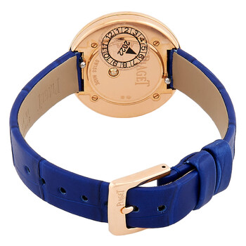 18kt rose gold case set with 9 brilliant-cut diamonds (approx. 0.18 ct). Blue alligator leather strap. Rotating 18kt rose gold bezel. Silver dial set with 11 brilliant-cut diamonds (approx. 0.07 ct). Rose gold-tone hands and diamond hour markers. Dial Type: Analog. Piaget Calibre 56P quartz movement. Scratch resistant sapphire crystal. Solid case back. Round case shape, case size: 29 mm, case thickness: 7.47 mm. Ardillon buckle clasp. Water resistant at 30 meters / 100 feet. Functions: hour, minute. Possession Series. Dress watch style. Piaget Possession Quartz Diamond Silver Dial Ladies Watch G0A45062.