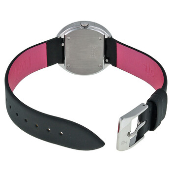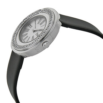 18kt white gold rotating upper case case with a black satin bracelet. 18kt white gold bezel set with 37 diamonds. Silver dial with silver-toned hands and Roman numeral hour markers. Dial Type: Analog. Quartz movement. Scratch resistant sapphire crystal. Solid case back. Case diameter: 29 mm. Case thickness: 6.2 mm. Round case shape. Tang clasp. Water resistant at 30 meters / 100 feet. Functions: hour, minute. Additional Info: 37 brilliant-cut diamonds set on the bezel (0.7 ct). Includes extra strap. Luxury watch style. Watch label: Swiss Made. Piaget Possession Silver Dial Black Satin Ladies Watch G0A36187.