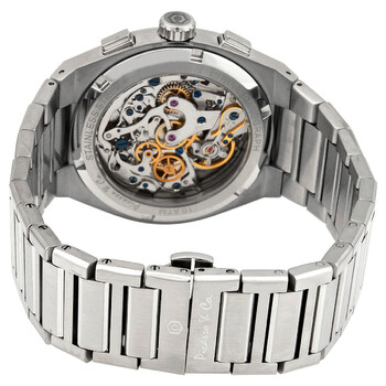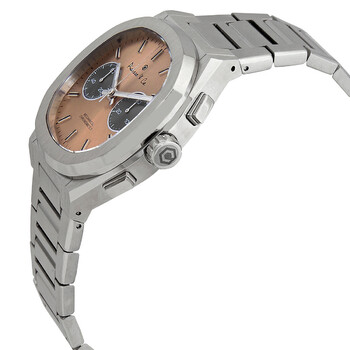 Stainless steel case with a stainless steel bracelet. Fixed stainless steel bezel. Salmon sun ray dial with luminous black hands and index hour markers. Minute markers around the outer rim. Dial Type: Analog. Luminescent hands and markers. Chronograph - two black sub-dials displaying: 60 second and 30 minute. Hand wind movement. Scratch resistant sapphire crystal. Transparent case back. Pillow case shape. Case size: 42 mm. Double fold over clasp. Water resistant at 100 meters / 330 feet. Functions: chronograph, hour, minute, second. Chairman II Series. Luxury watch style. Watch label: Swiss Made. Picasso and Co Chairman II Chronograph Hand Wind Men's Watch PWCH2SLSS.