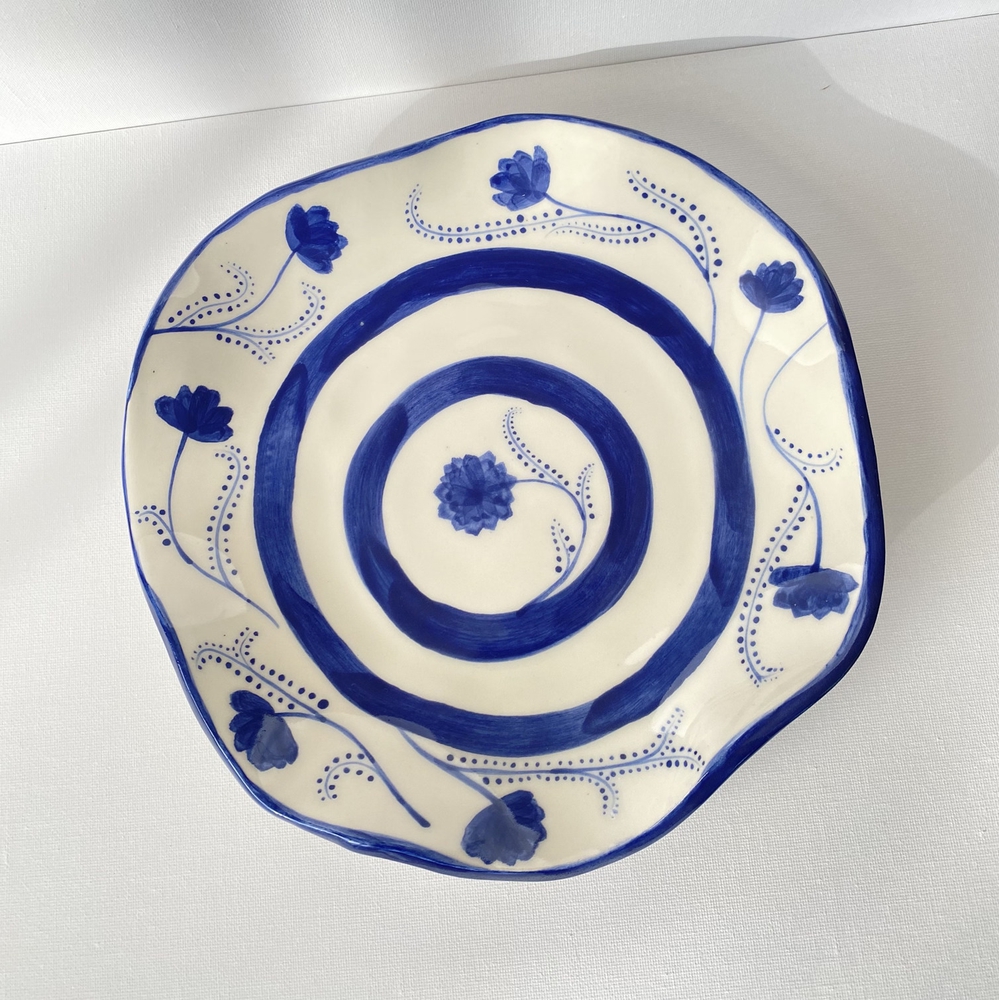 კერამიკის ხელნაკეთი თეფში, მოხატული ხელით. გამოყენებულია თეთრი თიხა, ჭიქურქვედა საღებავი, ჭიქური. გამომწვარია მაღალ ტემპერატურაზე.