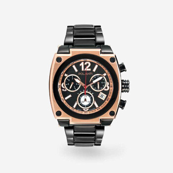Polanti - Torque II, Swiss Chronograph Ronda #Z60 Movement, Carbon Fiber Black Dial, Two-tone case, Black-Ip Band Two-tone stainless steel case with a black stainless steel bracelet. Fixed black stainless steel bezel. Black dial with rose gold-tone hands and Arabic numeral & index hour markers. Minute markers around the outer rim. Dial Type: Analog. Luminescent hands and markers. Date display at the 4 o'clock position. Three sub-dials displaying: day, 60 second and 30 minute. Ronda Caliber Z60 quartz movement. Scratch resistant sapphire crystal. Pull / push crown. Solid case back. Round case shape, case size: 45 mm, case thickness: 13 mm. Band width: 26 mm, band length: 7.5 inches. Deployment with push button release clasp. Water resistant at 100 meters / 330 feet. Functions: chronograph, date, day, hour, minute, small second. Torque II Chrono Series. Casual watch style. Watch label: Swiss Made. Polanti Torque Ii Chrono Chronograph Black Dial Men's Watch PLT2003-RGBK.