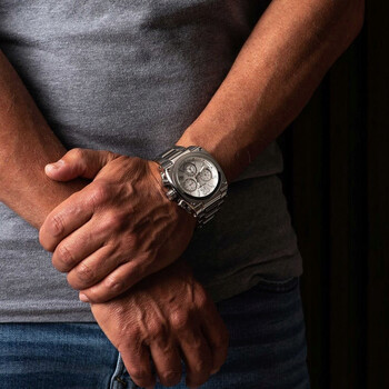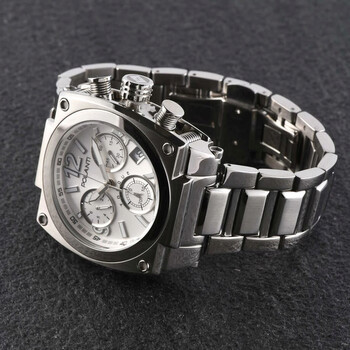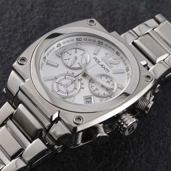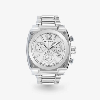 Polanti - Torque II, Swiss Chronograph Ronda #Z60 Movement, White Dial, Silvertone case band Silver-tone stainless steel case and bracelet. Fixed silver-tone stainless steel bezel. White dial with silver-tone hands and Arabic numeral & index hour markers. Minute markers around the outer rim. Dial Type: Analog. Luminescent hands and markers. Date display at the 4 o'clock position. Three sub-dials displaying: day, 60 second and 30 minute. Ronda Caliber Z60 quartz movement. Scratch resistant sapphire crystal. Pull / push crown. Solid case back. Round case shape, case size: 45 mm, case thickness: 13 mm. Band width: 26 mm, band length: 7.5 inches. Deployment with push button release clasp. Water resistant at 100 meters / 330 feet. Functions: chronograph, date, day, hour, minute, small second. Torque II Chrono Series. Casual watch style. Watch label: Swiss Chronograph. Polanti Torque Ii Chrono Chronograph White Dial Men's Watch PLT2003-SWT.