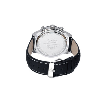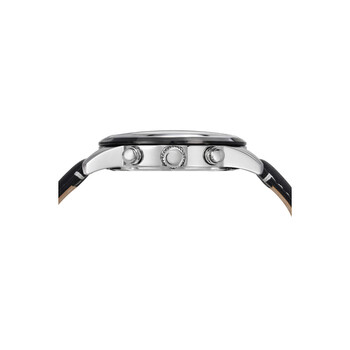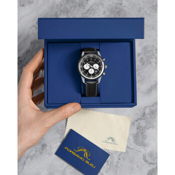 Stainless steel case with a black leather strap. Fixed silver-tone and black-plated bezel. Black dial with silver-tone hands and Arabic numeral hour markers. 24 hour markers. Minute markers around the outer rim. Dial Type: Analog. Date display between 4 and 5 o'clock position. Chronograph - three white sub-dials displaying: 60 second, 30 minute and 24 hour. Miyota caliber JS25 quartz movement. Scratch resistant mineral crystal. Solid case back. Round case shape. Case size: 44 mm. Band width: 22 mm. Tang clasp. Water resistant at 50 meters / 165 feet. Functions: chronograph, date, hour, minute, second, 24 hour. Arthur Series. Sport watch style. Watch label: Japan Movt. Porsamo Bleu Arthur Chronograph Quartz Black Dial Men's Watch 1091AARL.