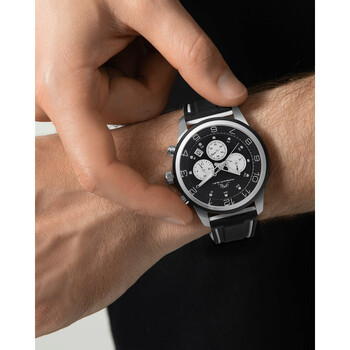 Silver-tone stainless steel case with a black silicone strap. Fixed silver-tone stainless steel bezel. Black dial with silver-tone hands and Arabic numeral hour markers. Minute markers around the outer rim. Dial Type: Analog. Date display between 4 and 5 o'clock position. Chronograph - three sub-dials displaying: 60 second, 30 minute and 24 hour. Miyota Caliber JS25 quartz movement. Scratch resistant mineral crystal. Solid case back. Round case shape, case size: 44 mm. Buckle clasp. Water resistant at 50 meters / 165 feet. Functions: chronograph, date, hour, minute, second. Arthur Series. Sport watch style. Watch label: Japan Movt. Porsamo Bleu Arthur Chronograph Quartz Black Dial Men's Watch 1092AARR.