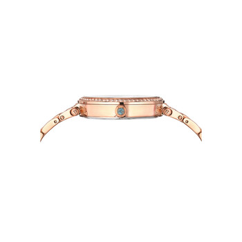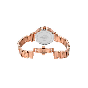 Rose gold-tone stainless steel case and bracelet. Fixed rose gold-tone stainless steel bezel. Mother of pearl dial with rose gold-tone hands and topaz hour markers. Dial Type: Analog. Miyota Caliber 2025 quartz movement. Scratch resistant mineral crystal. Solid case back. Round case shape, case size: 38 mm. Deployment with push button release clasp. Water resistant at 50 meters / 165 feet. Functions: hour, minute. Additional Info: genuine natural topaz gemstone hourmarkers. Chantal Series. Luxury watch style. Watch label: Japan Movt. Porsamo Bleu Chantal Quartz Ladies Watch 671CCHS.