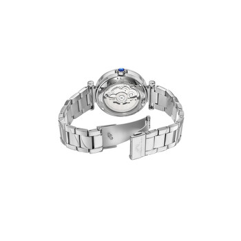 Stainless steel case with a stainless steel bracelet. Fixed stainless steel bezel. Blue (skeleton cut-out) dial with silver-tone hands and Roman numeral hour markers. Dial Type: Analog. TMI caliber NH70 automatic movement, containing 24 Jewels, bitting at 21600 vph, and has a power reserve of approximately 41 hours. Scratch resistant mineral crystal. Pull / push crown. Transparent case back. Round case shape. Case size: 36 mm. Case thickness: 12 mm. Band width: 21 mm. Deployment clasp with a push button release. Water resistant at 50 meters / 165 feet. Functions: hour, minute, second. Colette Series. Luxury watch style. Watch label: Japan Movt. Porsamo Bleu Colette Automatic Blue Dial Ladies Watch 1102ACOS.