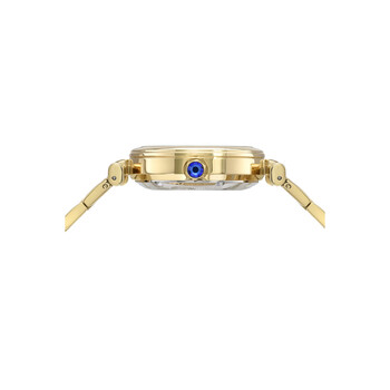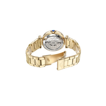 Yellow gold-tone stainless steel case and bracelet. Fixed yellow gold-tone bezel. White (skeleton) dial with yellow gold-tone hands and Roman numeral hour markers. Dial Type: Analog. TMI caliber NH70 automatic movement, containing 24 Jewels, bitting at 21600 vph, and has a power reserve of approximately 41 hours. Scratch resistant mineral crystal. Push / pull crown. Transparent case back. Round case shape. Case size: 36 mm. Case thickness: 12 mm. Deployment with push button release clasp. Water resistant at 50 meters / 165 feet. Functions: hour, minute, second. Colette Series. Luxury watch style. Watch label: Japan Movt. Porsamo Bleu Colette Automatic White Dial Ladies Watch 1101BCOS.