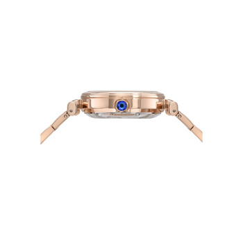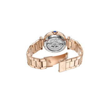 Rose gold-tone stainless steel case and bracelet. Fixed rose gold-tone bezel. White (skeleton cut-out) dial with rose gold-tone hands and Roman numeral hour markers. Dial Type: Analog. TMI caliber NH70 automatic movement, containing 24 Jewels, bitting at 21600 vph, and has a power reserve of approximately 41 hours. Scratch resistant mineral crystal. Pull / push crown. Transparent case back. Round case shape. Case size: 36 mm. Band width: 18 mm. Band length: 8 inches. Fold over clasp with a double push button release. Water resistant at 50 meters / 165 feet. Functions: hour, minute, second. Colette Series. Luxury watch style. Watch label: Japan Movt. Porsamo Bleu Colette Automatic White Dial Ladies Watch 1101CCOS.