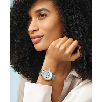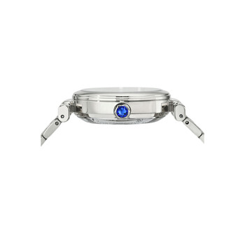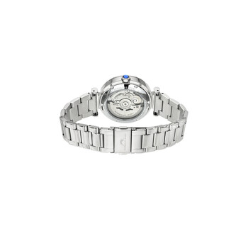 Porsamo Bleu Colette Ladies' Automatic Watch With Stainless Steel Case And Band; White Enamel Skeleton Dial; Silver Tone Silver-tone stainless steel case and bracelet. Fixed silver-tone stainless steel bezel. White dial with silver-tone hands and index hour markers. Dial Type: Analog. Luminescent hands. Automatic movement. Scratch resistant mineral crystal. Pull / push crown. Solid case back. Round case shape, case size: 36 mm, case thickness: 11.2 mm. Band width: 18 mm. Fold over with double push button release clasp. Water resistant at 50 meters / 165 feet. Functions: hour, minute, second. Colette Series. Luxury watch style. Watch label: Japan Movt. Porsamo Bleu Colette White Dial Ladies Watch 1103ACOS.