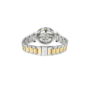 Porsamo Bleu Colette Ladies' Automatic Watch With Stainless Steel Case And Band; White Enamel Skeleton Dial; Gold Tone Yellow gold-tone stainless steel case and bracelet. Fixed yellow gold-tone stainless steel bezel. White dial with yellow gold-tone hands and index hour markers. Dial Type: Analog. Luminescent hands. Automatic movement. Scratch resistant mineral crystal. Pull / push crown. Solid case back. Round case shape, case size: 36 mm, case thickness: 11.2 mm. Band width: 18 mm. Fold over with double push button release clasp. Water resistant at 50 meters / 165 feet. Functions: hour, minute, second. Colette Series. Luxury watch style. Watch label: Japan Movt. Porsamo Bleu Colette White Dial Ladies Watch 1103BCOS.