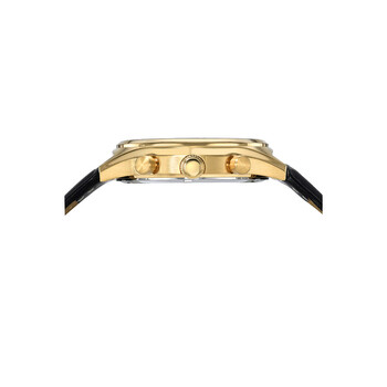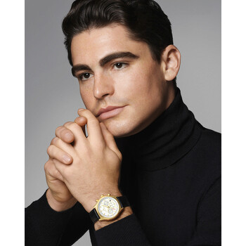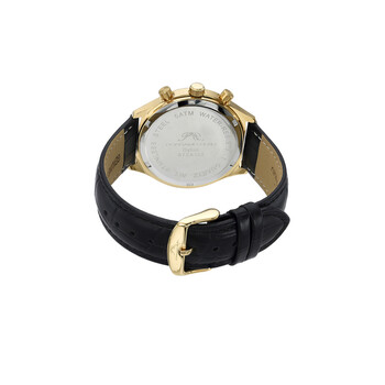 Porsamo Bleu Dylan Men's Multifunction Watch With Stainless Steel Case And Genuine Leather Band; Gold, White And Black Yellow gold-tone stainless steel case with a black leather strap. Uni-directional rotating yellow gold-tone stainless steel bezel. White dial with yellow gold-tone hands and index hour markers. Minute markers around the outer rim. Dial Type: Analog. Luminescent hands and markers. Date display between 4 and 5 o'clock position. Three sub-dials displaying: date, 24 hour and 24 hour. Miyota Caliber JP25 quartz movement. Scratch resistant mineral crystal. Pull / push crown. Solid case back. Round case shape, case size: 41 mm, case thickness: 11 mm. Band width: 20 mm, band length: 8 inches. Buckle clasp. Water resistant at 50 meters / 165 feet. Functions: date, day, GMT, second time zone, hour, minute, second. Additional Info: date calendar day/ 24hours/ 24hours dual time display. Dylan Series. Luxury watch style. Watch label: Japan Movt. Porsamo Bleu Dylan GMT Quartz White Dial Men's Watch 872ADYL.