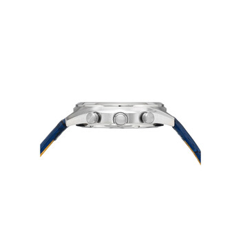 Silver-tone stainless steel case with a blue genuine leather strap. Fixed silver-tone stainless steel bezel. Blue dial with silver-tone hands and index hour markers. Minute markers around the outer rim. Dial Type: Analog. Date display between 4 and 5 o'clock position. Three sub-dials displaying: date, 24 hour and 24 hour. Miyota Caliber JP25 quartz movement. Scratch resistant mineral crystal. Solid case back. Round case shape, case size: 41 mm. Water resistant at 50 meters / 165 feet. Functions: date, day, GMT, second time zone, hour, minute, second. Dylan Series. Dress watch style. Watch label: Japan Movt. Porsamo Bleu Dylan Quartz Blue Dial Men's Watch 871CDYL.