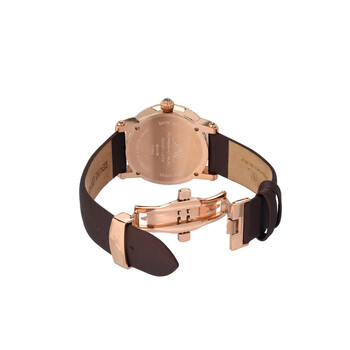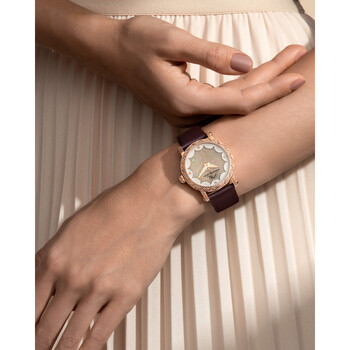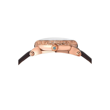 Porsamo Bleu Genevieve Ladies' Watch With Stainless Steel Case And Black Satin Covered Genuine Leather Strap; Crushed Natural Crystal Dial With White Topaz Gemstones; Rose Tone And Brown Rose gold-tone stainless steel case with a brown leather strap. Uni-directional rotating rose gold-tone stainless steel bezel. White dial with rose gold-tone hands and index hour markers. Dial Type: Analog. Luminescent hands and markers. Miyota Caliber 203A quartz movement. Scratch resistant mineral crystal. Pull / push crown. Solid case back. Round case shape, case size: 38 mm, case thickness: 12 mm. Band width: 20 mm, band length: 7 inches. Fold over clasp with a safety release. Water resistant at 50 meters / 165 feet. Functions: hour, minute, second. Additional Info: crushed natural crystal dial with white topaz gemstones. Genevieve Series. Luxury watch style. Watch label: Japan Movement. Porsamo Bleu Genevieve Quartz White Dial Ladies Watch 681CGEL.