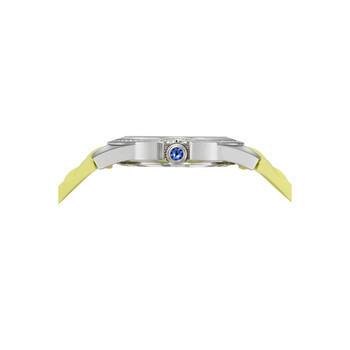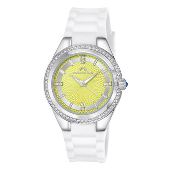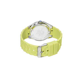 Silver-tone stainless steel case with a green silicone strap. Fixed silver-tone stainless steel bezel. Green dial with silver-tone hands and index hour markers. Dial Type: Analog. Date display at the 6 o'clock position. Miyota Caliber GM10 quartz movement. Scratch resistant mineral crystal. Solid case back. Round case shape, case size: 37 mm. Buckle clasp. Water resistant at 30 meters / 100 feet. Functions: date, hour, minute, second. Additional Info: comes with two interchangeable silicone straps, lime green and white. Guilia Series. Fashion watch style. Watch label: Japan Movt. Porsamo Bleu Guilia Quartz Green Dial Ladies Watch 1122DGUR.
