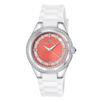 Silver-tone stainless steel case with a red silicone strap. Fixed silver-tone stainless steel bezel. Red dial with silver-tone hands and index hour markers. Dial Type: Analog. Date display at the 6 o'clock position. Miyota Caliber GM10 quartz movement. Scratch resistant mineral crystal. Solid case back. Round case shape, case size: 37 mm. Buckle clasp. Water resistant at 30 meters / 100 feet. Functions: date, hour, minute, second. Additional Info: comes with two interchangeable silicone straps, red and white. Guilia Series. Fashion watch style. Watch label: Japan Movt. Porsamo Bleu Guilia Quartz Red Dial Ladies Watch 1122AGUR.