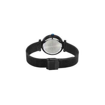 Porsamo Bleu Hazel Ladies' Watch With Stainless Steel Case And Mesh Bracelet; With Topaz Hour Markers; Faceted Crystal Bezel; Mother Of Pearl Black Dial; Black Black stainless steel case and bracelet. Fixed black stainless steel bezel. Black dial with silver-tone hands and index hour markers. Dial Type: Analog. Luminescent hands. Miyota Caliber 2035 quartz movement. Scratch resistant mineral crystal. Pull / push crown. Solid case back. Round case shape, case size: 33 mm, case thickness: 8.5 mm. Band width: 14 mm. Fold over with double push button release clasp. Water resistant at 30 meters / 100 feet. Functions: hour, minute, second. Hazel Series. Luxury watch style. Watch label: Japan Movt. Porsamo Bleu Hazel Quartz Black Dial Ladies Watch 1272CHAS.