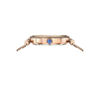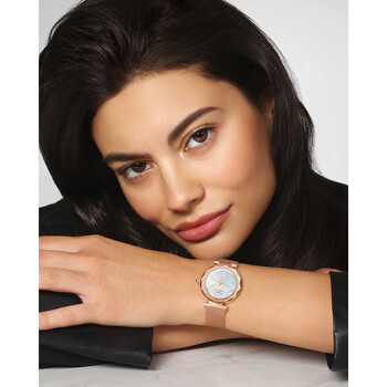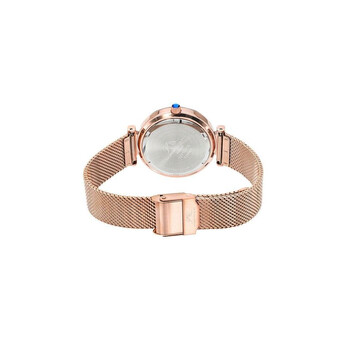 Porsamo Bleu Hazel Ladies' Watch With Stainless Steel Case And Mesh Bracelet; With Topaz Hour Markers; Faceted Crystal Bezel; Mother Of Pearl White Dial; Rose Tone Rose gold-tone stainless steel case and bracelet. Fixed rose gold-tone stainless steel bezel. White dial with rose gold-tone hands and index hour markers. Dial Type: Analog. Luminescent hands. Miyota Caliber 2035 quartz movement. Scratch resistant mineral crystal. Pull / push crown. Solid case back. Round case shape, case size: 33 mm, case thickness: 8.5 mm. Band width: 14 mm. Fold over with double push button release clasp. Water resistant at 30 meters / 100 feet. Functions: hour, minute, second. Hazel Series. Luxury watch style. Watch label: Japan Movt. Porsamo Bleu Hazel Quartz White Dial Ladies Watch 1271CHAS.