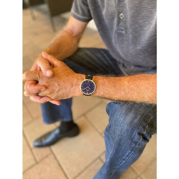 Silver-tone stainless steel case with a black genuine leather strap. Fixed silver-tone stainless steel bezel. Blue dial with silver-tone hands and index hour markers. Dial Type: Analog. 60 second subdials. Miyota Caliber 1L45 quartz movement. Scratch resistant mineral crystal. Solid case back. Round case shape, case size: 41 mm. Water resistant at 30 meters / 100 feet. Functions: hour, minute, small second. Henry Series. Dress watch style. Watch label: Japan Movt. Porsamo Bleu Henry Quartz Blue Dial Men's Watch 842AHEL.
