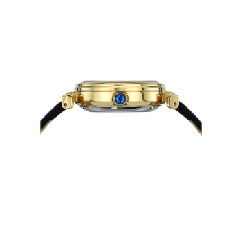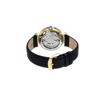 Porsamo Bleu Laura Ladies' Automatic Watch With Stainless Steel Case And Genuine Leather Black Strap; With Topaz Hour Markers; Mother Of Pearl Skeleton White Dial; Gold Tone & Black. Yellow gold-tone stainless steel case with a black genuine leather strap. Fixed yellow gold-tone stainless steel bezel. White dial with yellow gold-tone hands and index hour markers. Dial Type: Analog. TMI Caliber NH70 Automatic movement, containing 24 Jewels, bitting at 21600 vph, and has a power reserve of approximately 41 hours. Scratch resistant mineral crystal. Pull / push crown. Solid case back. Round case shape, case size: 36 mm, case thickness: 12 mm. Band width: 18 mm. Buckle clasp. Water resistant at 50 meters / 165 feet. Functions: hour, minute, second. Additional Info: stunning mother of pearl dial with topaz gemstone hour markers. Laura Series. Luxury watch style. Watch label: Japan Movt. Porsamo Bleu Laura Automatic White Dial Ladies Watch 1211BLAL.