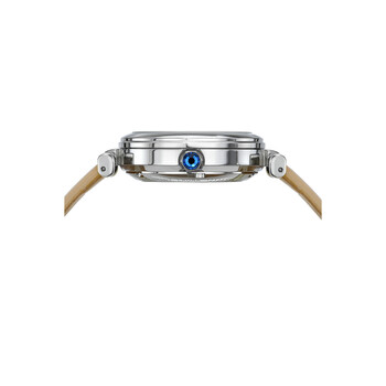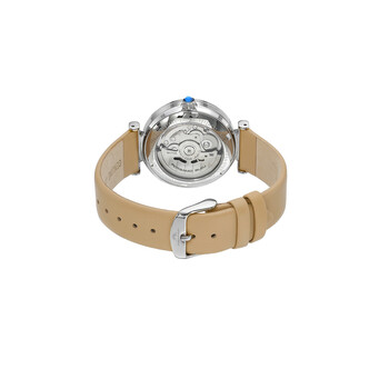 Porsamo Bleu Laura Ladies' Automatic Watch With Stainless Steel Case And Genuine Leather Black Strap; With Topaz Hour Markers; Mother Of Pearl Skeleton White Dial; Silver Tone & Beige. Silver-tone stainless steel case with a beige genuine leather strap. Fixed silver-tone stainless steel bezel. White dial with silver-tone hands and index hour markers. Dial Type: Analog. TMI Caliber NH70 Automatic movement, containing 24 Jewels, bitting at 21600 vph, and has a power reserve of approximately 41 hours. Scratch resistant mineral crystal. Pull / push crown. Solid case back. Round case shape, case size: 36 mm, case thickness: 12 mm. Band width: 18 mm. Buckle clasp. Water resistant at 50 meters / 165 feet. Functions: hour, minute, second. Additional Info: stunning mother of pearl dial with topaz gemstone hour markers. Laura Series. Luxury watch style. Watch label: Japan Movt. Porsamo Bleu Laura Automatic White Dial Ladies Watch 1212ALAL.