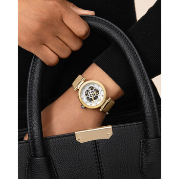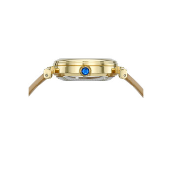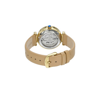 Porsamo Bleu Laura Ladies' Automatic Watch With Stainless Steel Case And Genuine Leather Black Strap; With Topaz Hour Markers; Mother Of Pearl Skeleton White Dial; Gold Tone & Beige. Yellow gold-tone stainless steel case with a beige genuine leather strap. Fixed yellow gold-tone stainless steel bezel. White dial with yellow gold-tone hands and index hour markers. Dial Type: Analog. TMI Caliber NH70 Automatic movement, containing 24 Jewels, bitting at 21600 vph, and has a power reserve of approximately 41 hours. Scratch resistant mineral crystal. Pull / push crown. Solid case back. Round case shape, case size: 36 mm, case thickness: 12 mm. Band width: 18 mm. Buckle clasp. Water resistant at 50 meters / 165 feet. Functions: hour, minute, second. Additional Info: stunning mother of pearl dial with topaz gemstone hour markers. Laura Series. Luxury watch style. Watch label: Japan Movt. Porsamo Bleu Laura Automatic White Dial Ladies Watch 1212BLAL.