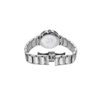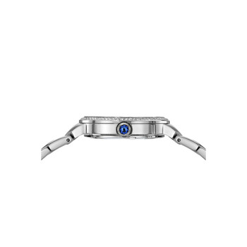 Porsamo Bleu Luna Ladies' Watch With Topaz Gemstone Inlaid Stainless Steel Bezel; Genuine, Natural Sodalite Gemstone Dial; Silver Tone Silver-tone stainless steel case and bracelet. Fixed silver-tone stainless steel bezel. Blue dial with silver-tone hands and index hour markers. Dial Type: Analog. Ronda Caliber 763 quartz movement. Scratch resistant mineral crystal. Solid case back. Round case shape, case size: 34 mm. Fold over clasp with a safety release. Water resistant at 50 meters / 165 feet. Functions: hour, minute, second. Luna Series. Luxury watch style. Watch label: Swiss Movt. Porsamo Bleu Luna Quartz Blue Dial Ladies Watch 1181FLUS.