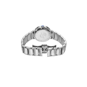 Porsamo Bleu Luna Ladies' Watch With Topaz Gemstone Inlaid Stainless Steel Bezel; Genuine, Naturtal, Blue Sandstone Gemstone Dial; Silver Tone Silver-tone stainless steel case and bracelet. Fixed silver-tone stainless steel bezel. Blue dial with silver-tone hands and index hour markers. Dial Type: Analog. Ronda Caliber 763 quartz movement. Scratch resistant mineral crystal. Solid case back. Round case shape, case size: 34 mm. Fold over clasp with a safety release. Water resistant at 50 meters / 165 feet. Functions: hour, minute, second. Luna Series. Luxury watch style. Watch label: Swiss Movt. Porsamo Bleu Luna Quartz Blue Dial Ladies Watch 1181GLUS.