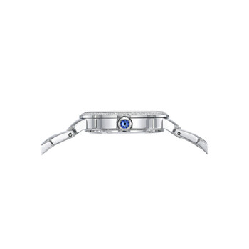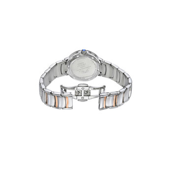 Porsamo Bleu Luna Ladies' Watch With Topaz Gemstone Inlaid Stainless Steel Bezel; Enamel Dial; Two Tone Silver-tone stainless steel case with a two-tone (silver-tone and rose gold-tone) stainless steel bracelet. Fixed rose gold-tone stainless steel bezel. Pink dial with rose gold-tone hands and index hour markers. Dial Type: Analog. Ronda Caliber 763 quartz movement. Scratch resistant mineral crystal. Solid case back. Round case shape, case size: 34 mm. Fold over clasp with a safety release. Water resistant at 50 meters / 165 feet. Functions: hour, minute, second. Luna Series. Luxury watch style. Watch label: Swiss Movt. Porsamo Bleu Luna Quartz Pink Dial Ladies Watch 1181DLUS.