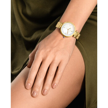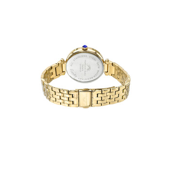 Porsamo Bleu Natalie Ladies' Watch With Stainless Steel Case And Bracelet; White Guilloche Dial with crystals; Crystal Hour Markers; Gold Tone Yellow gold-tone stainless steel case and bracelet. Fixed yellow gold-tone stainless steel bezel. White dial with yellow gold-tone hands and index hour markers. Dial Type: Analog. Miyota Caliber 2035 quartz movement. Scratch resistant mineral crystal. Pull / push crown. Solid case back. Round case shape, case size: 36 mm, case thickness: 6.8 mm. Band width: 14 mm. Fold over with double push button release clasp. Water resistant at 50 meters / 165 feet. Functions: hour, minute, second. Natalie Series. Luxury watch style. Watch label: Japan Movt. Porsamo Bleu Natalie Quartz White Dial Ladies Watch 1251BNAS.