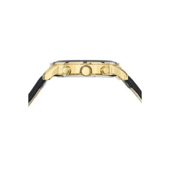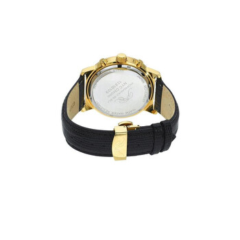Porsamo Bleu NYC Chrono Men's Chronograph Watch With Mother of Pearl Black Dial; Genuine Leather Strap, Gold and Black Yellow gold-tone stainless steel case with a black leather strap. Fixed yellow gold-tone stainless steel bezel. Black dial with yellow gold-tone hands and index hour markers. Minute markers around the outer rim. Dial Type: Analog. Chronograph - three sub-dials displaying: 60 second, 30 minute and 24 hour. Miyota JS 20 Quartz quartz movement. Scratch resistant mineral crystal. Pull / push crown. Solid case back. Round case shape, case size: 47 mm, case thickness: 12 mm. Band width: 26 mm. Deployment with push button release clasp. Water resistant at 100 meters / 330 feet. Functions: chronograph, hour, minute, second. Nyc Chrono Series. Luxury watch style. Watch label: Japan Movt. Porsamo Bleu Nyc Chrono Chronograph Quartz Black Dial Men's Watch 1281BNYL.