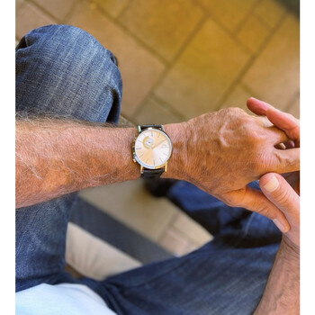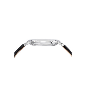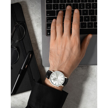 Stainless steel case with a black leather strap. Fixed stainless steel bezel. Silver dial with luminous silver-tone hands and index hour markers. Dial Type: Analog. Luminescent hands. Small seconds sub-dial. Miyota caliber 1L45 quartz movement. Scratch resistant mineral crystal. Pull / push crown. Transparent case back. Round case shape. Case size: 42 mm. Case thickness: 4 mm. Band width: 22 mm. Tang clasp. Water resistant at 30 meters / 100 feet. Functions: hour, minute, small second. Parker Series. Dress watch style. Watch label: Japan Movt. Porsamo Bleu Parker Quartz Silver Dial Men's Watch 831APAL.