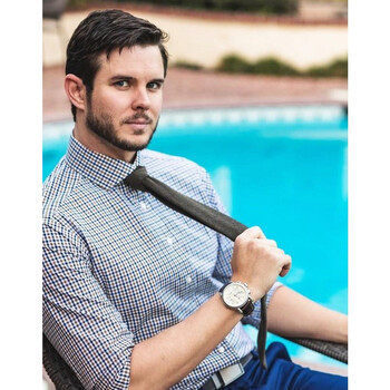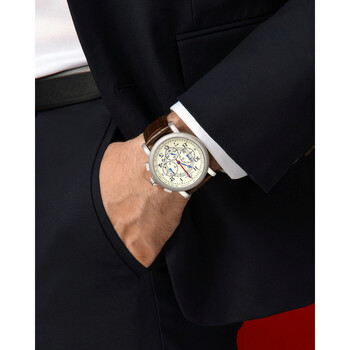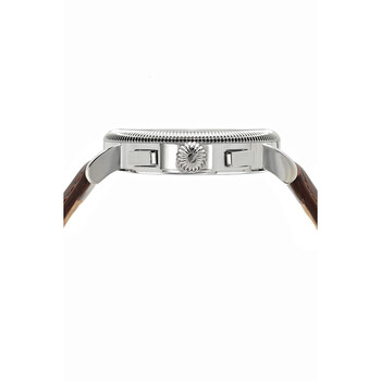 Silver-tone stainless steel case with a brown genuine leather strap. Fixed silver-tone stainless steel bezel. Beige dial with blue hands and Arabic numeral & index hour markers. Minute markers around the outer rim. Dial Type: Analog. Date display between 4 and 5 o'clock position. Chronograph - three sub-dials displaying: 60 minute, 60 second and 1/20 second. Miyota Caliber 6S20 quartz movement. Scratch resistant mineral crystal. Solid case back. Round case shape, case size: 48 mm. Water resistant at 100 meters / 330 feet. Functions: chronograph, date, hour, minute, second. Phileas Series. Dress watch style. Watch label: Japan Movt. Porsamo Bleu Phileas Chronograph Quartz Men's Watch 471APHL.