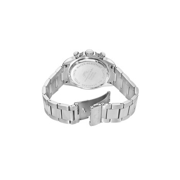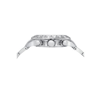 Silver-tone stainless steel case and bracelet. Fixed silver-tone stainless steel bezel. Black dial with silver-tone hands and index hour markers. Minute markers around the outer rim. Dial Type: Analog. Luminescent hands and markers. Date display between 4 and 5 o'clock position. Miyota JP25-00C Quartz quartz movement. Scratch resistant mineral crystal. Solid case back. Round case shape, case size: 44 mm. Deployment with push button release clasp. Water resistant at 100 meters / 330 feet. Functions: chronograph, day, date, hour, minute, second. Preston Series. Luxury watch style. Porsamo Bleu Preston Chronograph Quartz Black Dial Men's Watch 1032APRS.