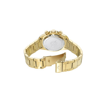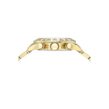 Yellow gold-tone stainless steel case and bracelet. Fixed yellow gold-tone bezel showing tachymeter markings. Blue dial with luminous yellow gold-tone hands and index hour markers. Minute markers around the outer rim. Dial Type: Analog. Luminescent hands and markers. Date display between the 4 and 5 o'clock positions. Two sub-dials displaying: 24 hours and 24 hours. Day of the week sub-dial. Miyota JP25-00C quartz movement. Scratch resistant mineral crystal. Pull / push crown. Solid case back. Round case shape. Case size: 36 mm. Case thickness: 13 mm. Fold over clasp with a push button release. Water resistant at 100 meters / 330 feet. Functions: chronograph, tachymeter, day, date, hour, minute, second. Preston Series. Luxury watch style. Porsamo Bleu Preston Chronograph Quartz Blue Dial Men's Watch 1033BPRS.