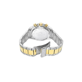 Stainless steel case with a two-tone (silver-tone and yellow gold-tone) stainless steel bracelet. Fixed yellow gold-tone bezel showing tachymeter markings. Blue dial with luminous yellow gold-tone hands and index hour markers. Minute markers around the outer rim. Dial Type: Analog. Luminescent hands and markers. Date display between the 4 and 5 o'clock positions. Chronograph - two sub-dials displaying: 24 hours and 24 hours. Day of the week sub-dial. Miyota JP25-00C quartz movement. Scratch resistant mineral crystal. Solid case back. Round case shape. Case size: 42 mm. Case thickness: 13 mm. Band width: 22 mm. Deployment with push button release clasp. Water resistant at 100 meters / 330 feet. Functions: chronograph, tachymeter, day, date, hour, minute, second. Preston Series. Luxury watch style. Porsamo Bleu Preston Chronograph Quartz Blue Dial Men's Watch 1033CPRS.