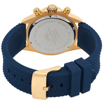 Yellow gold-tone stainless steel case with a blue silicone strap. Fixed yellow gold-tone stainless steel bezel. Blue dial with yellow gold-tone hands and index hour markers. Minute markers around the outer rim. Dial Type: Analog. Luminescent hands and markers. Date display between 4 and 5 o'clock position. Three sub-dials displaying: date, 24 hour and 24 hour. Miyota Caliber JP25 quartz movement. Scratch resistant mineral crystal. Pull / push crown. Solid case back. Round case shape, case size: 41 mm, case thickness: 13 mm. Band width: 22 mm, band length: 8 inches. Buckle clasp. Water resistant at 100 meters / 330 feet. Functions: date, day, GMT, second time zone, hour, minute, second. Additional Info: day, date, dual time features. Preston Sport Series. Luxury watch style. Watch label: Japan Movt. Porsamo Bleu Preston Sport Quartz Blue Dial Men's Watch 1034BPRR.
